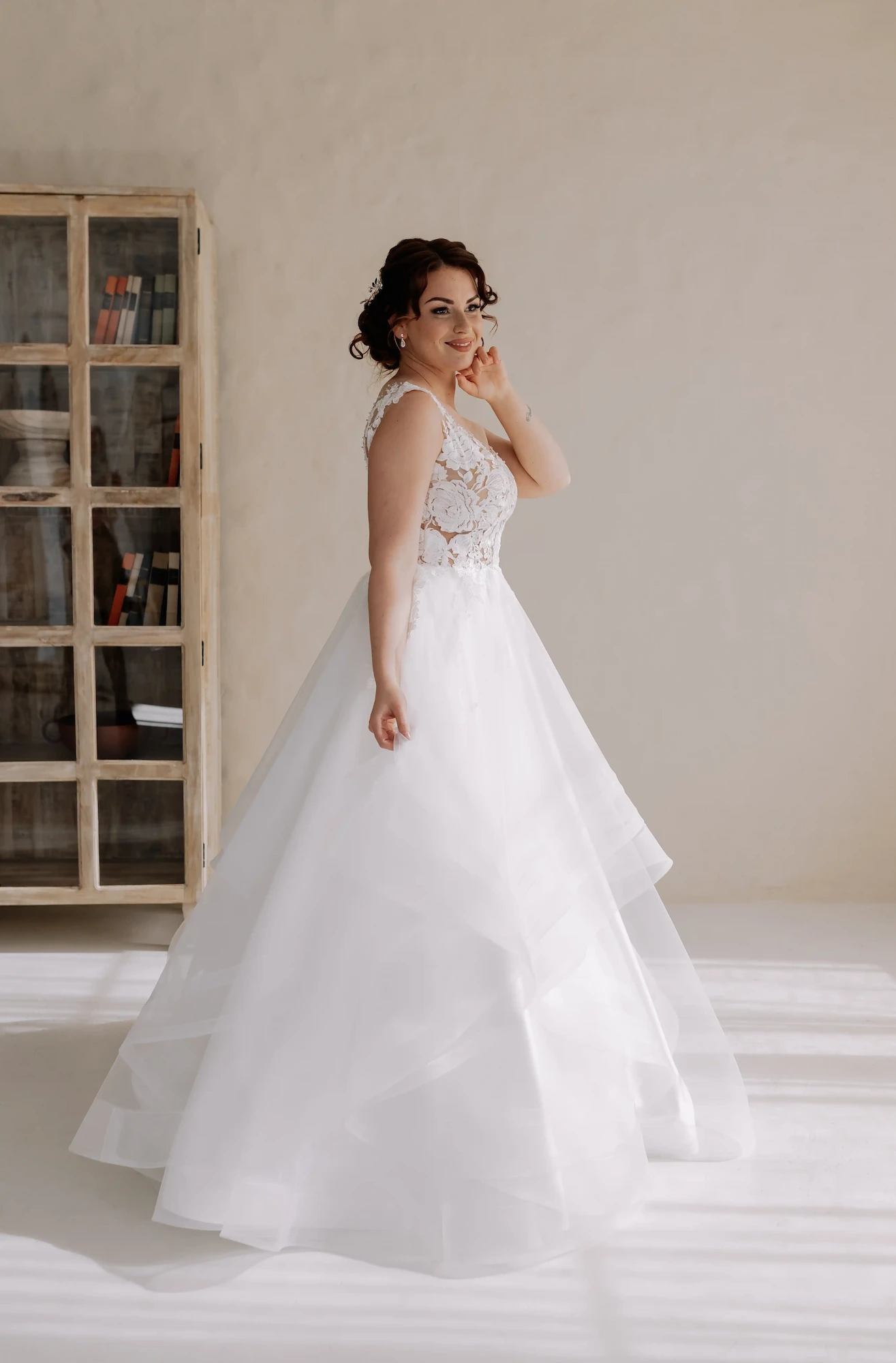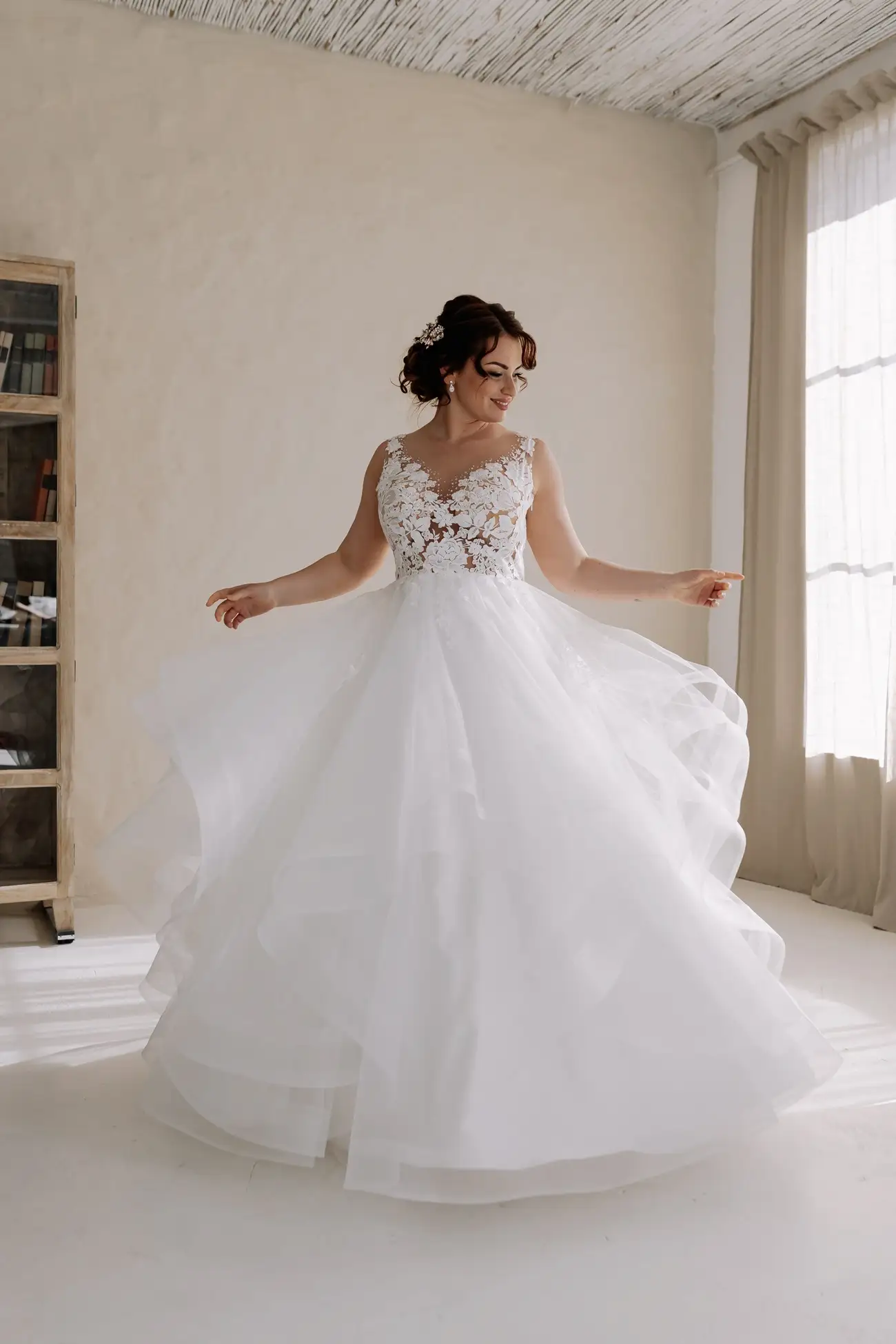 Fodros nagy szoknyás ruhánk, illúzió tüll csipke felsővel könnyű viselet. Abroncs nélkül is fantasztikus látványt adnak viselőjének. Nálunk egy élményt is kapsz a ruhapróbád mellé!