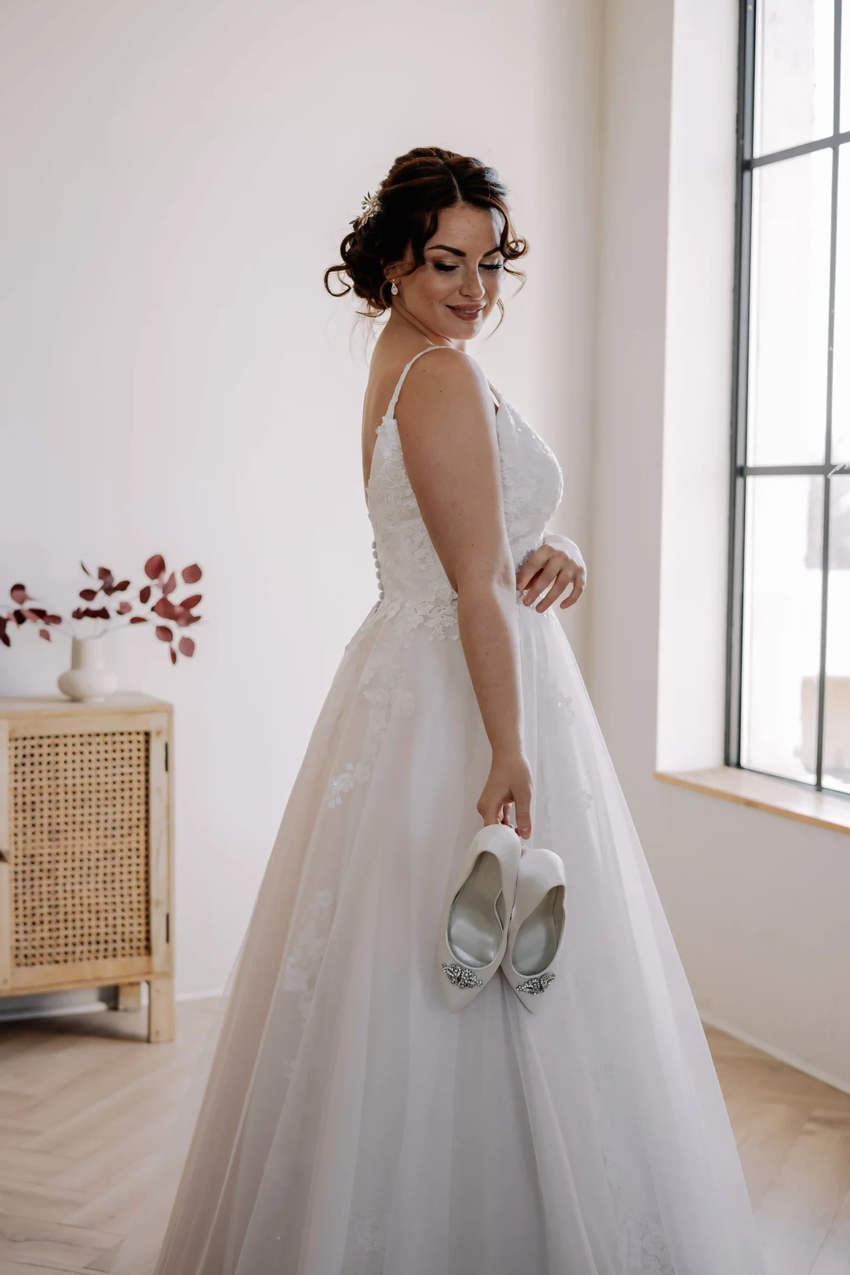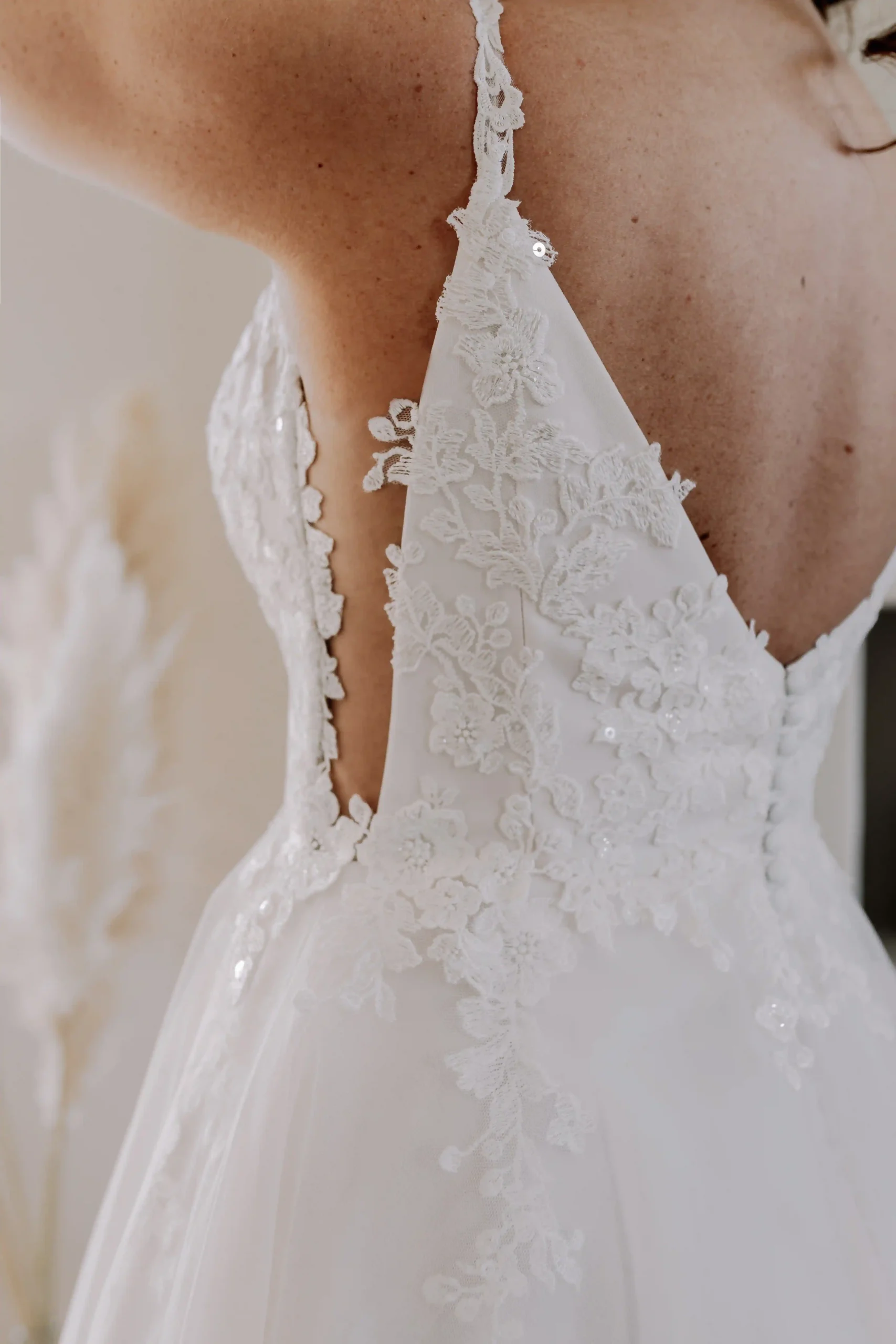 A enyhén púder színű esküvőiruha. A mélyebb kivágás és a háta formája , igen csak megnyújtja a testalkatot. Az oldalában lévő tüll rész még inkább karcsú hatást mutat. Nálunk egy élményt is kapsz a ruhapróbád mellé!
