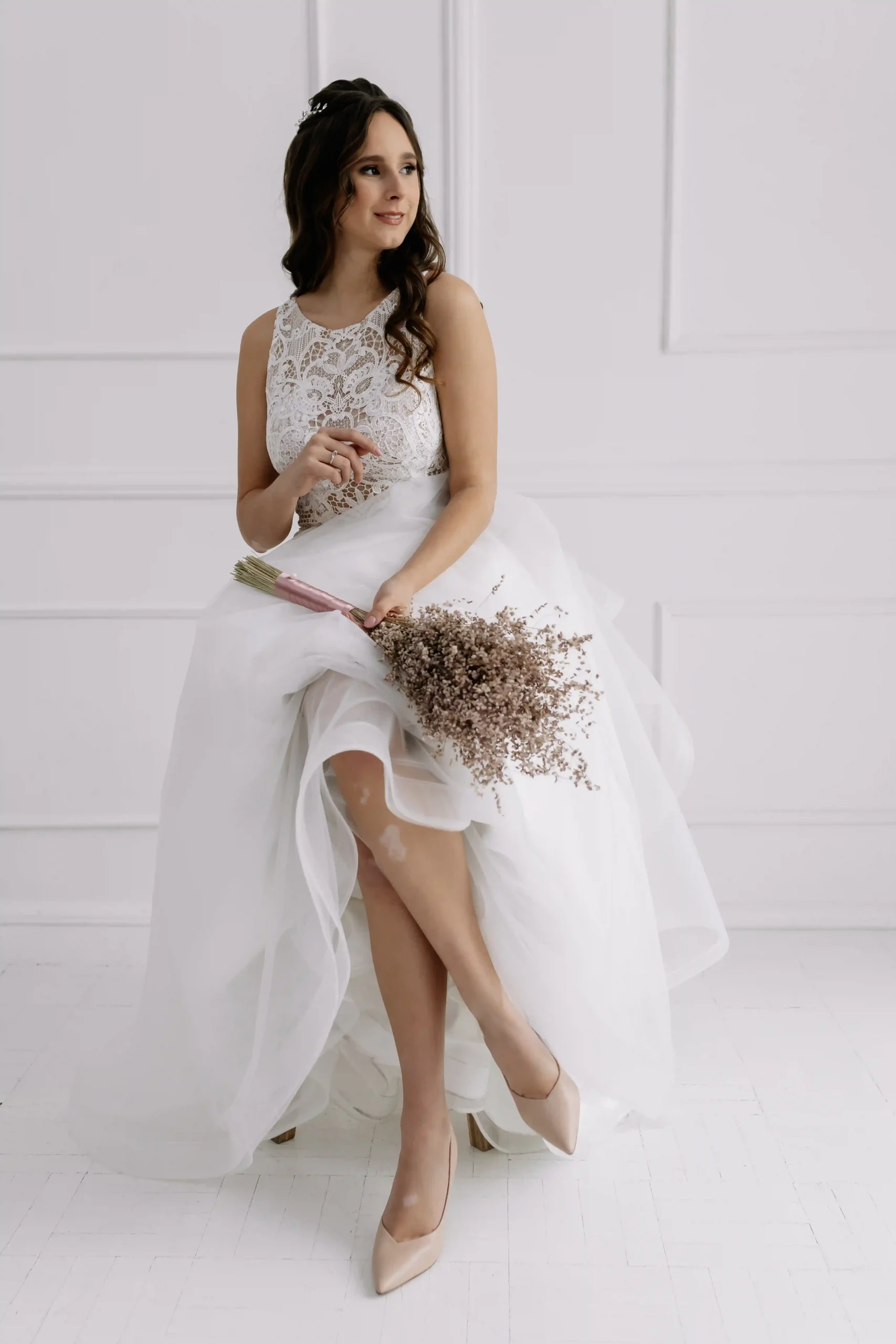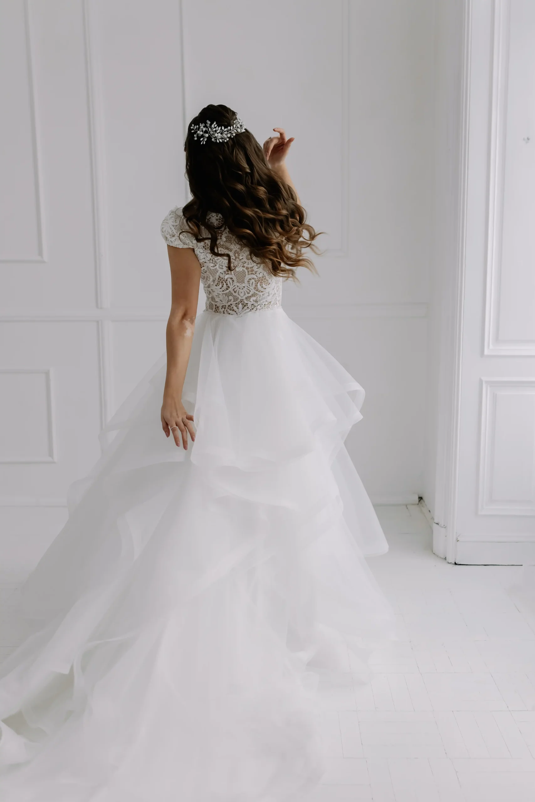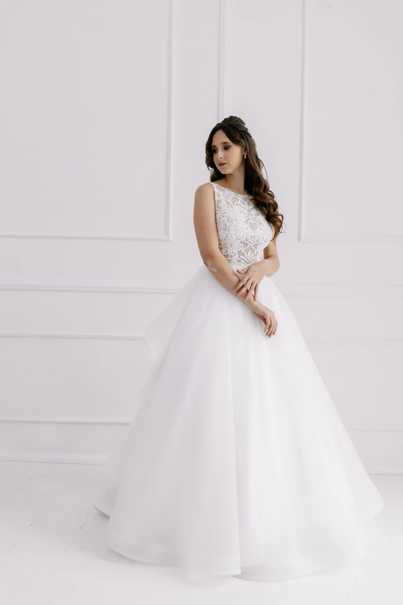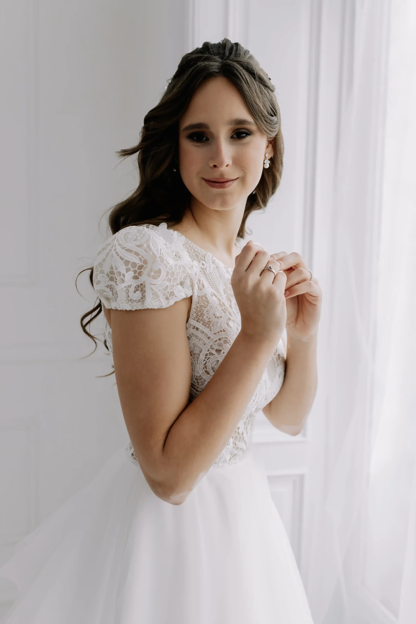 Halter szabású felsőrész, látványos pamut csipkével díszítve. Uszály része látványos, vizhullámmal díszítve. Felgombolható uszalyrész. Nálunk egy élményt is kapsz a ruhapróbád mellé!