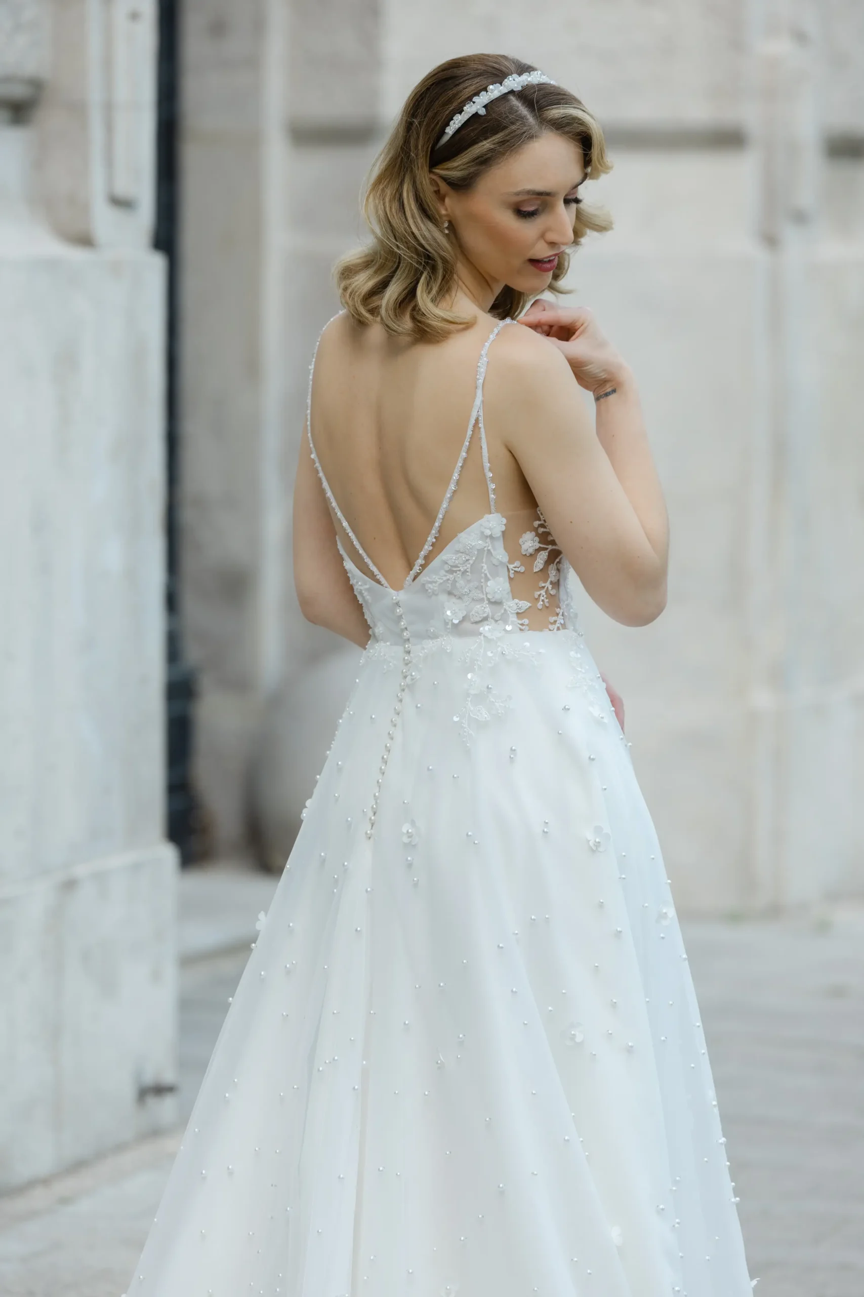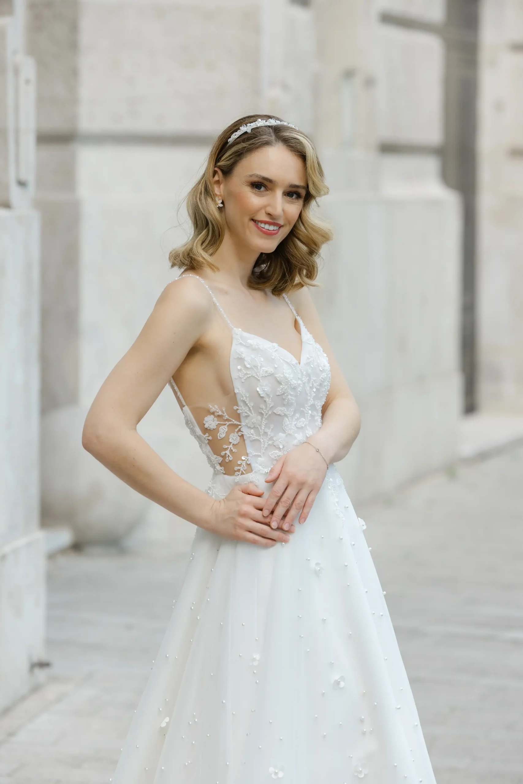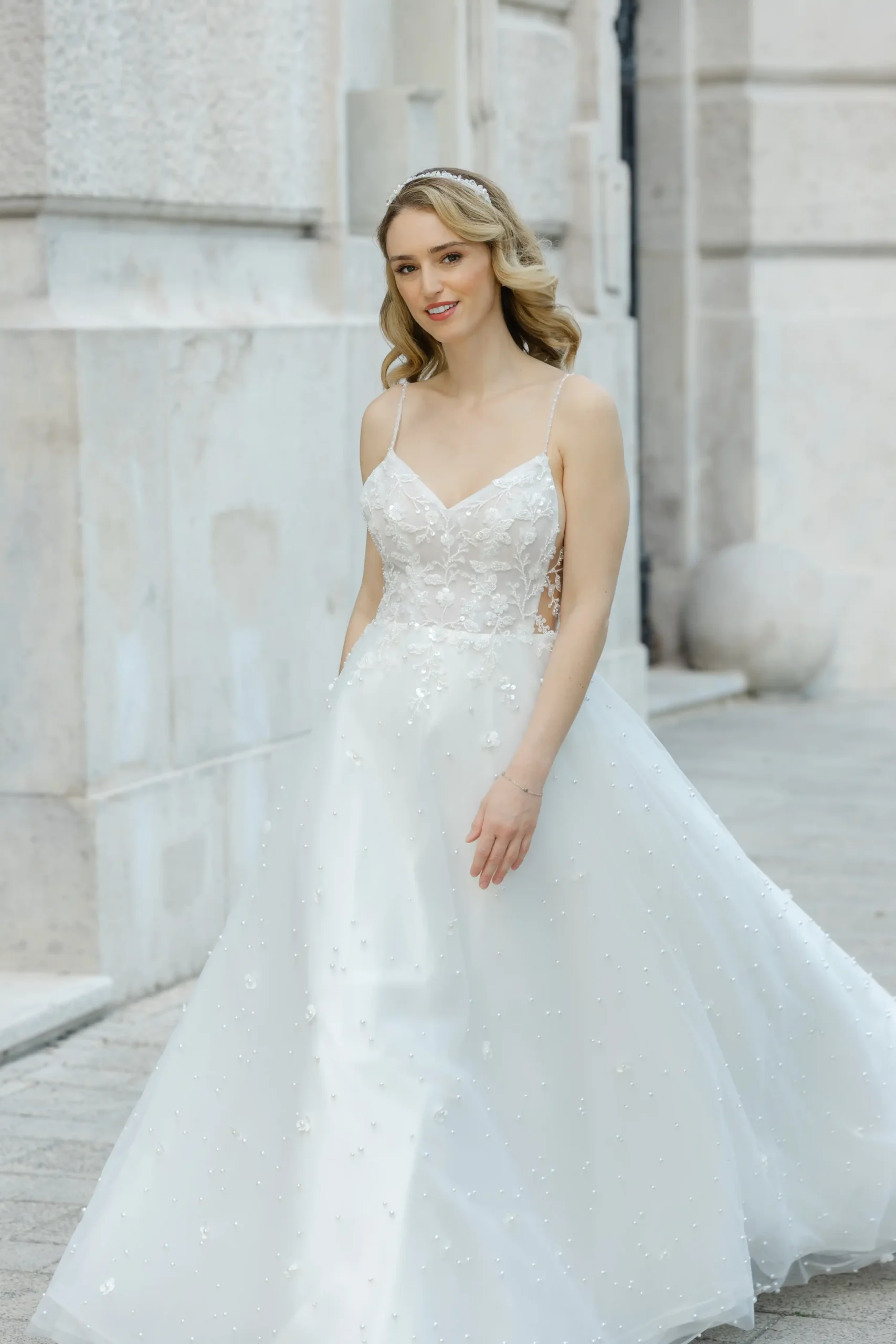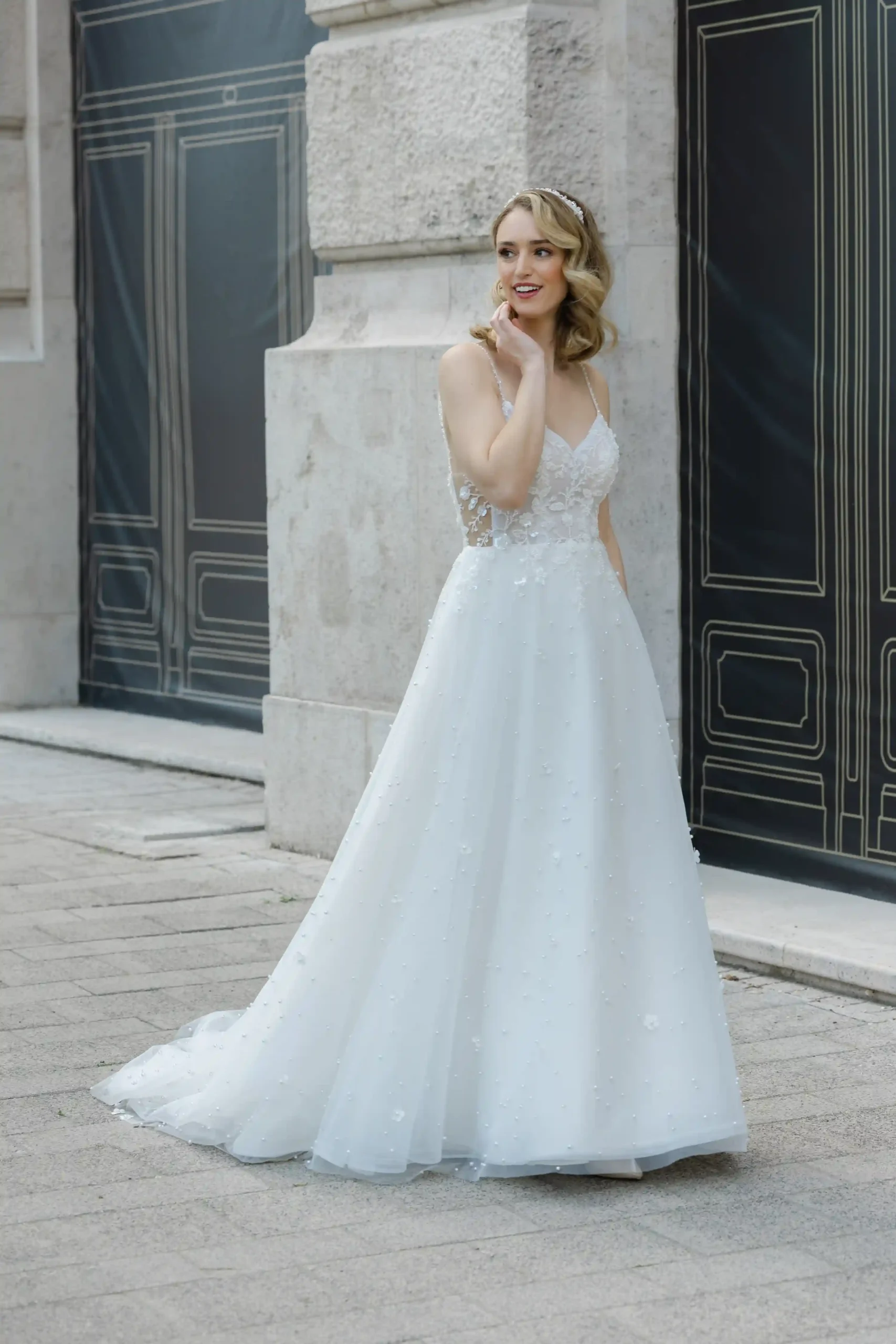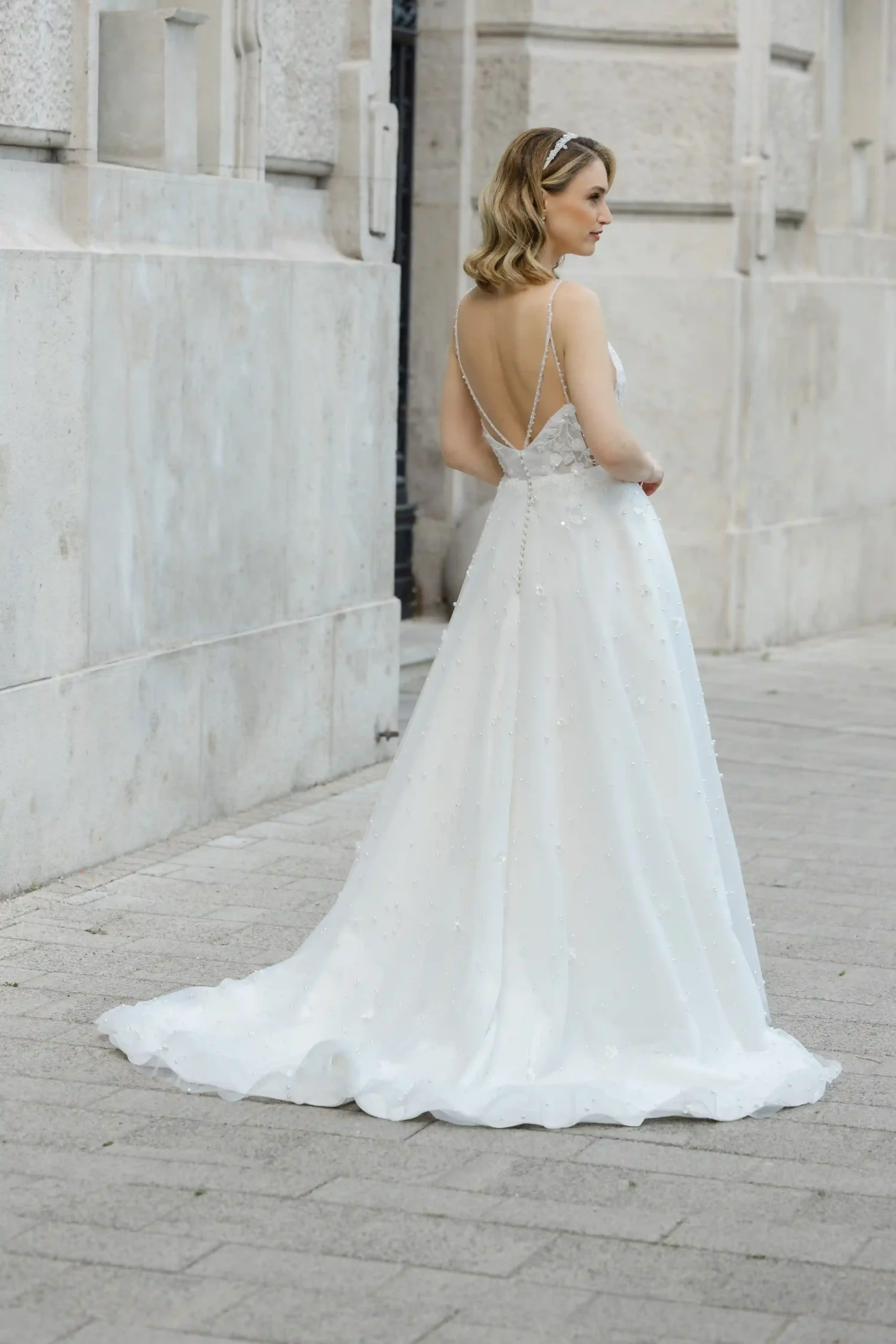 Az egész ruha izgalmas apróságokból áll össze. Gyöngyből kivarrt csipke díszíti a felsőrészt, oldalán nyitott hatása még karcsubbá varázsolja a testalkatod. Szoknyáját virágok és gyöngyök sokasága díszíti. Nálunk egy élményt is kapsz a ruhapróbád mellé!