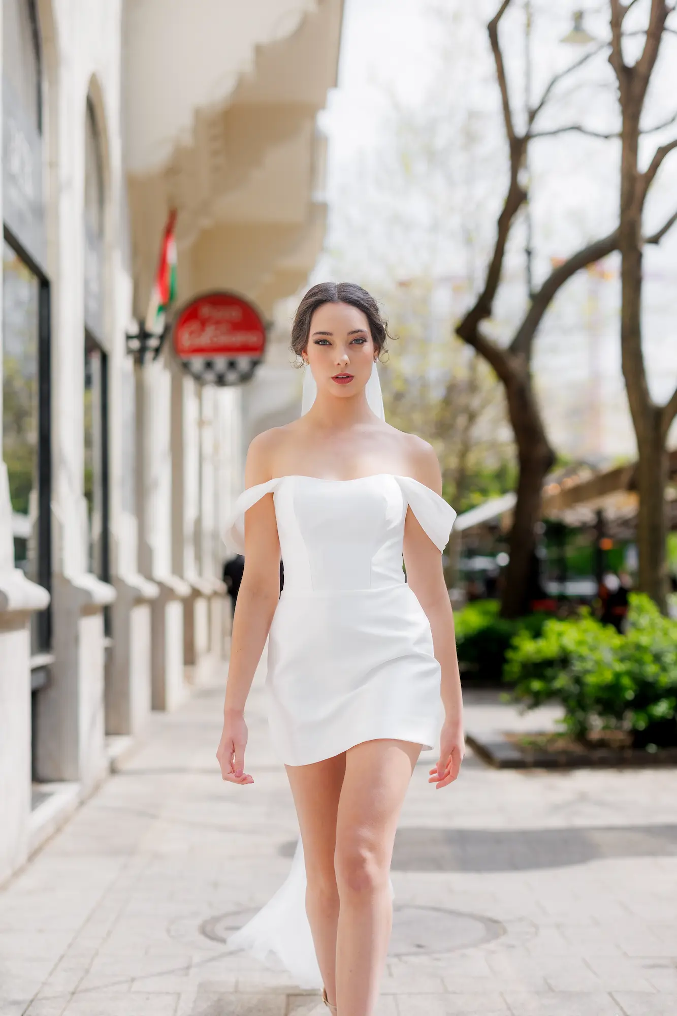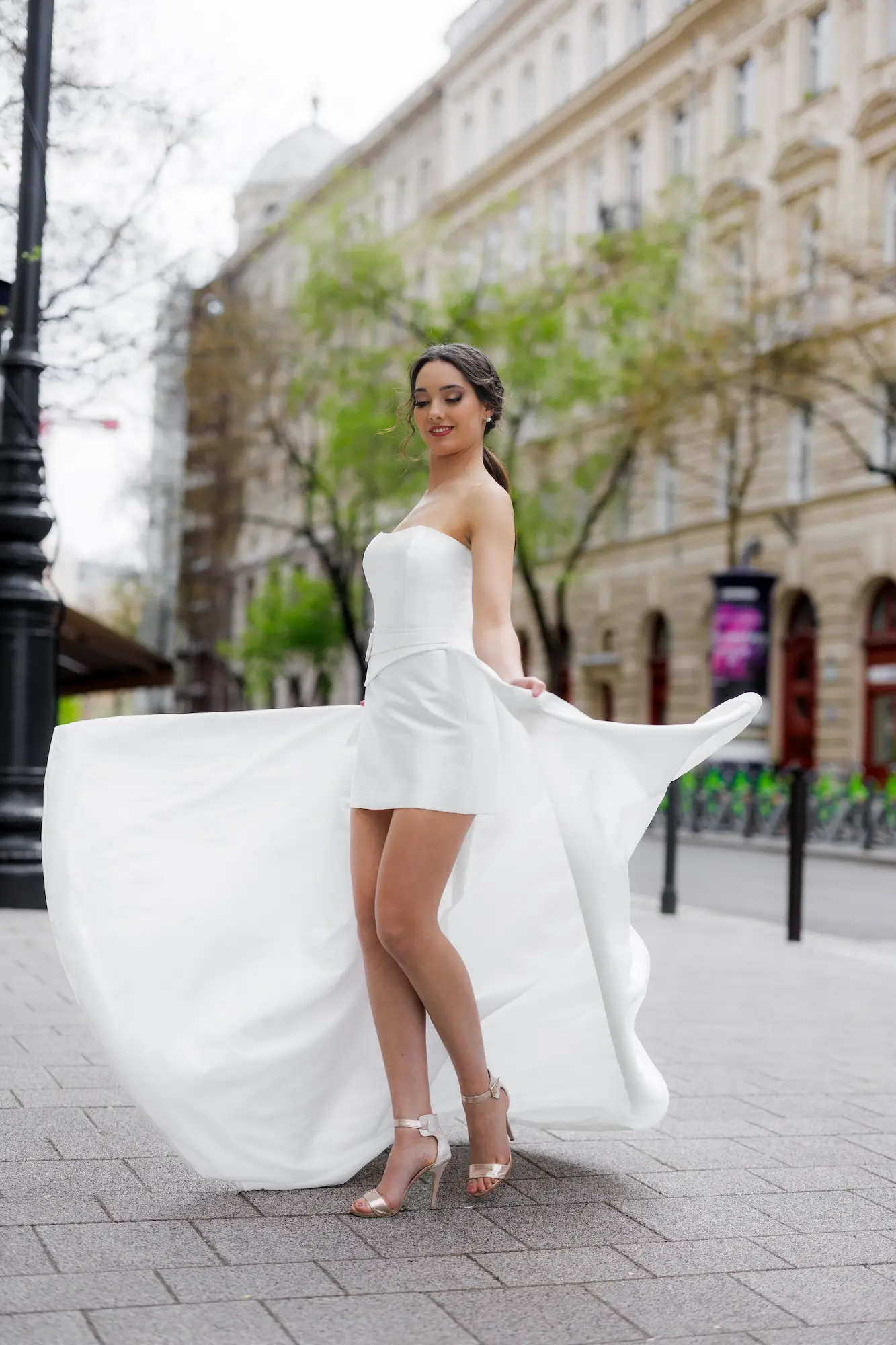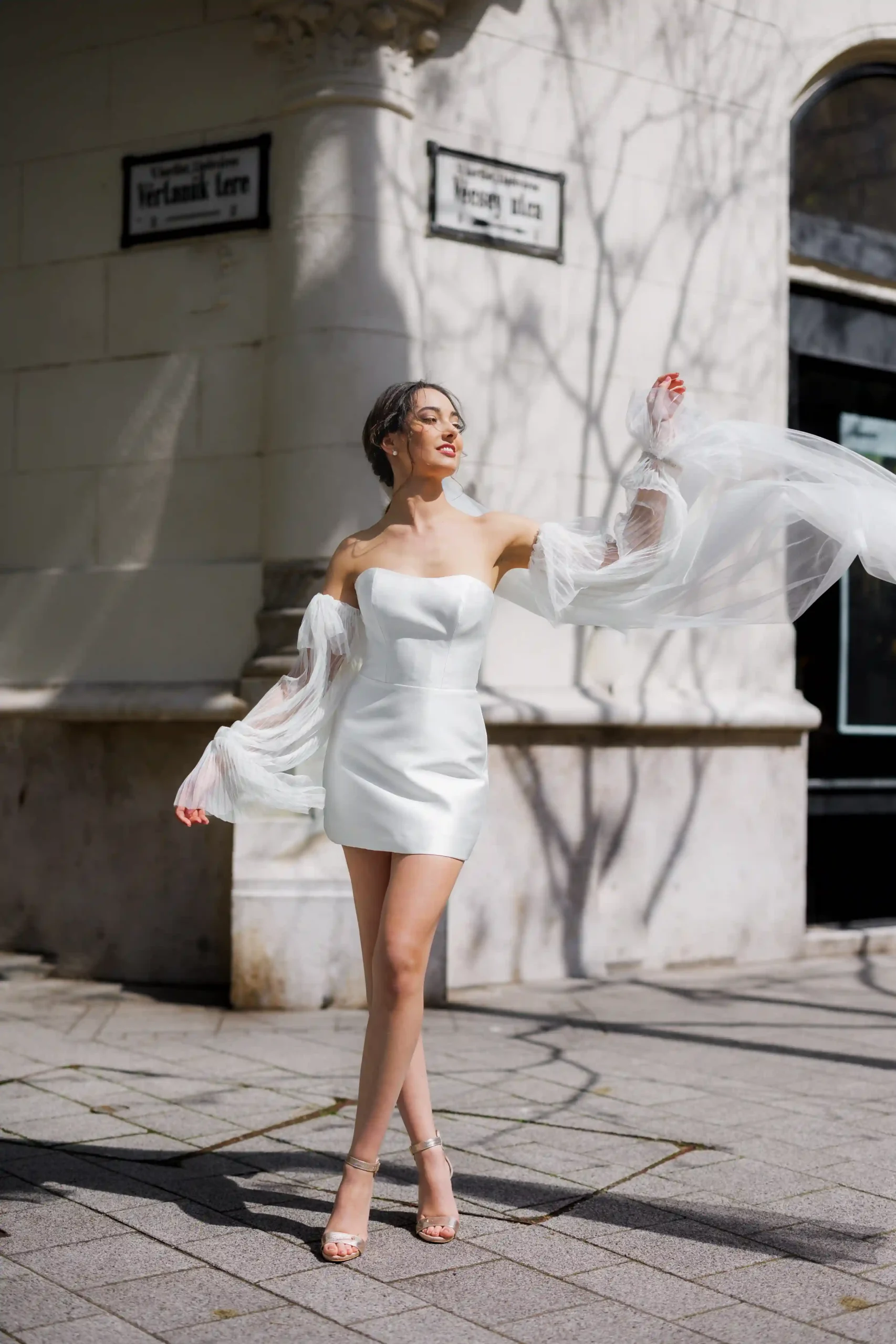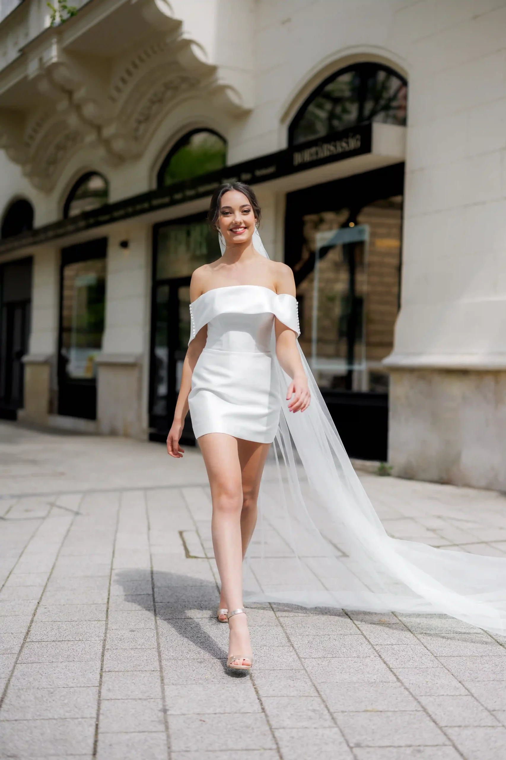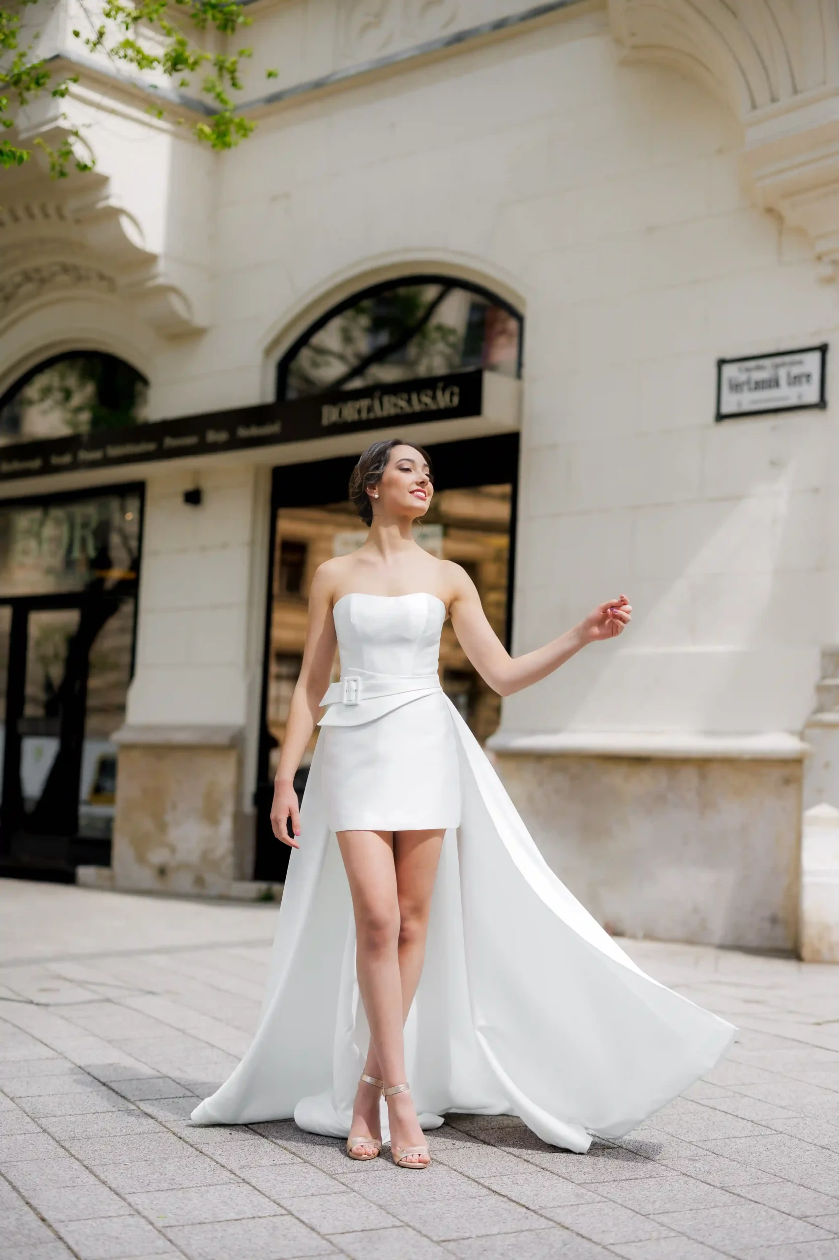 Rövid mikadó selyem ruha. Variálható hosszú uszállyal, karmantyúval, boleróval. Polgári szertartasra ajánljuk. Nálunk egy élményt is kapsz a ruhapróbád mellé!