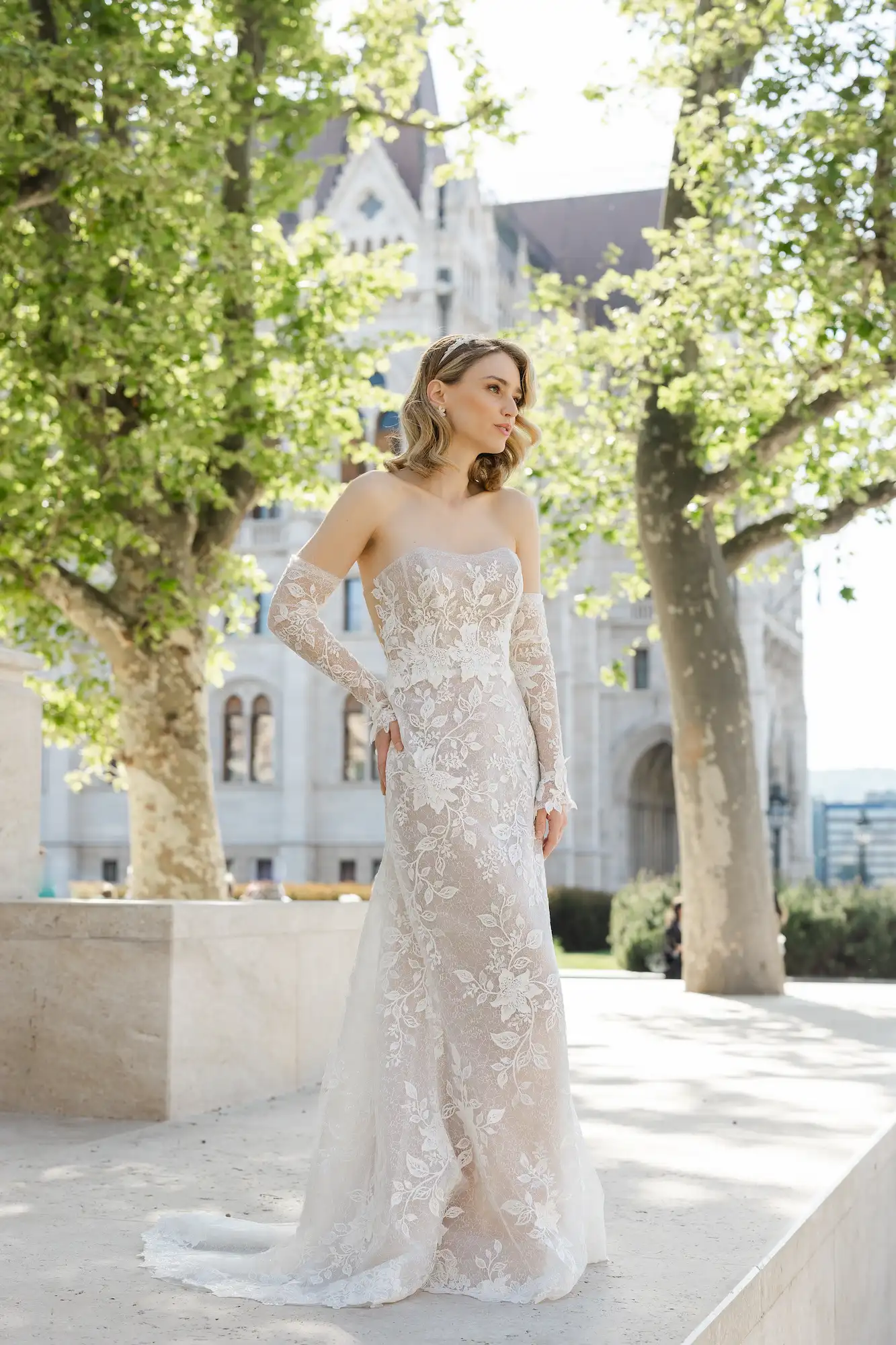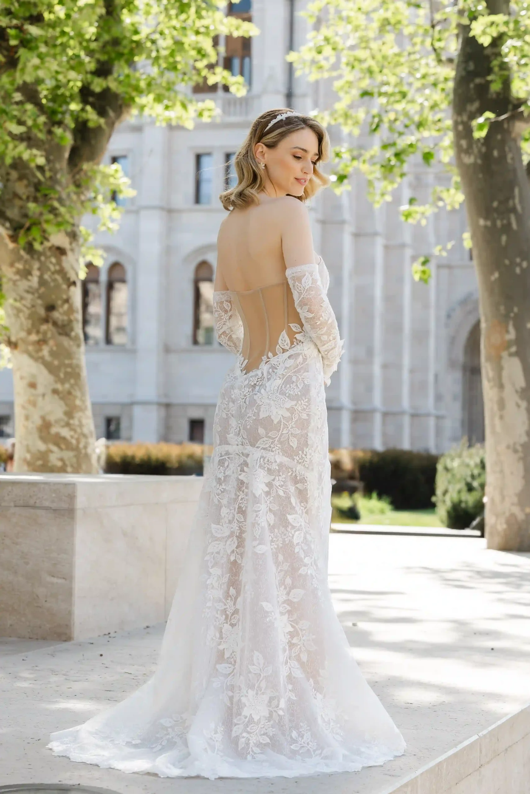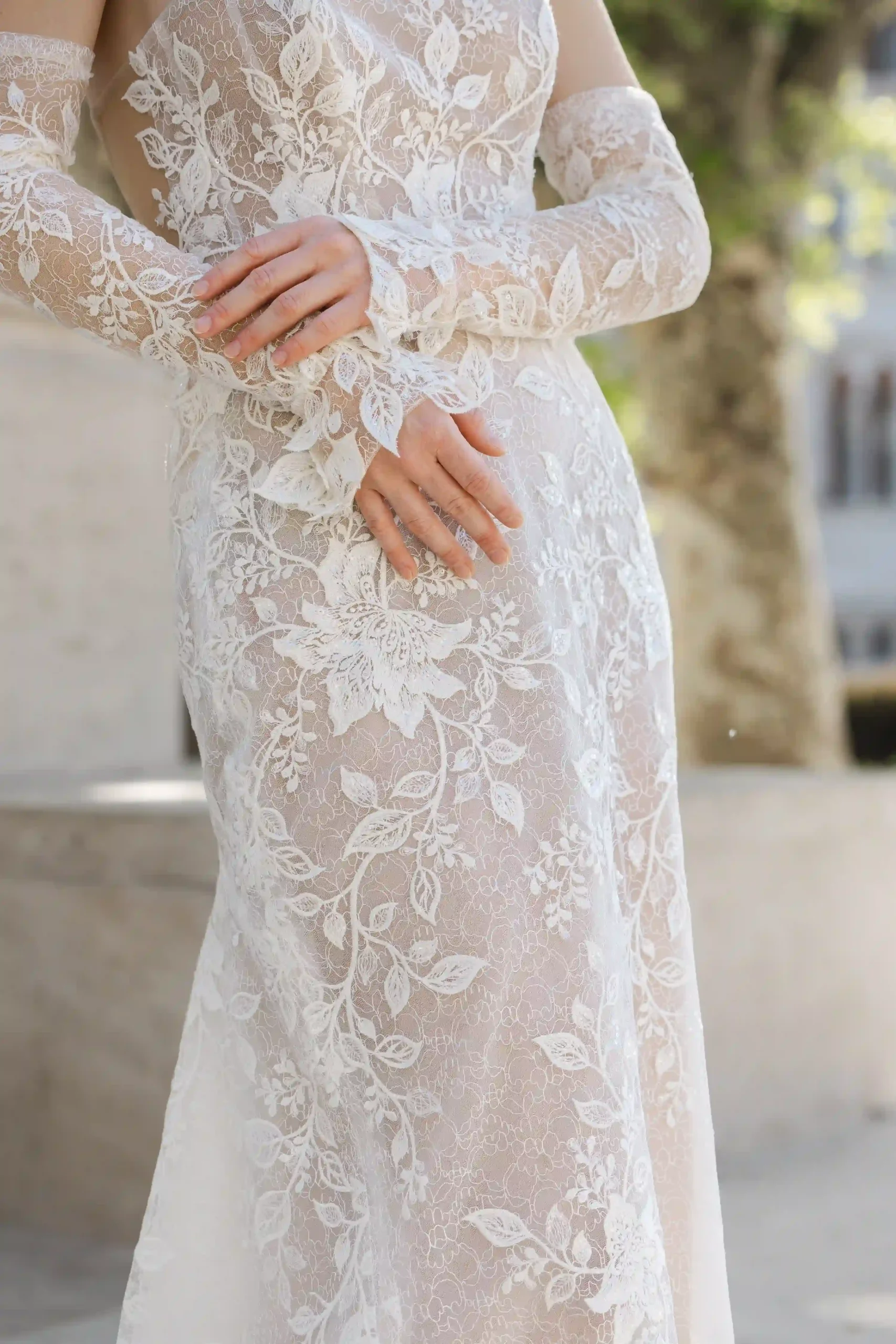 Csipke ruha melynek anyaga elasztikus, így könnyű és komfortos viselet. Külön kesztyű rész is van hozzá, melynek csuklóját 3D levelek díszítik. Nálunk egy élményt is kapsz a ruhapróbád mellé!