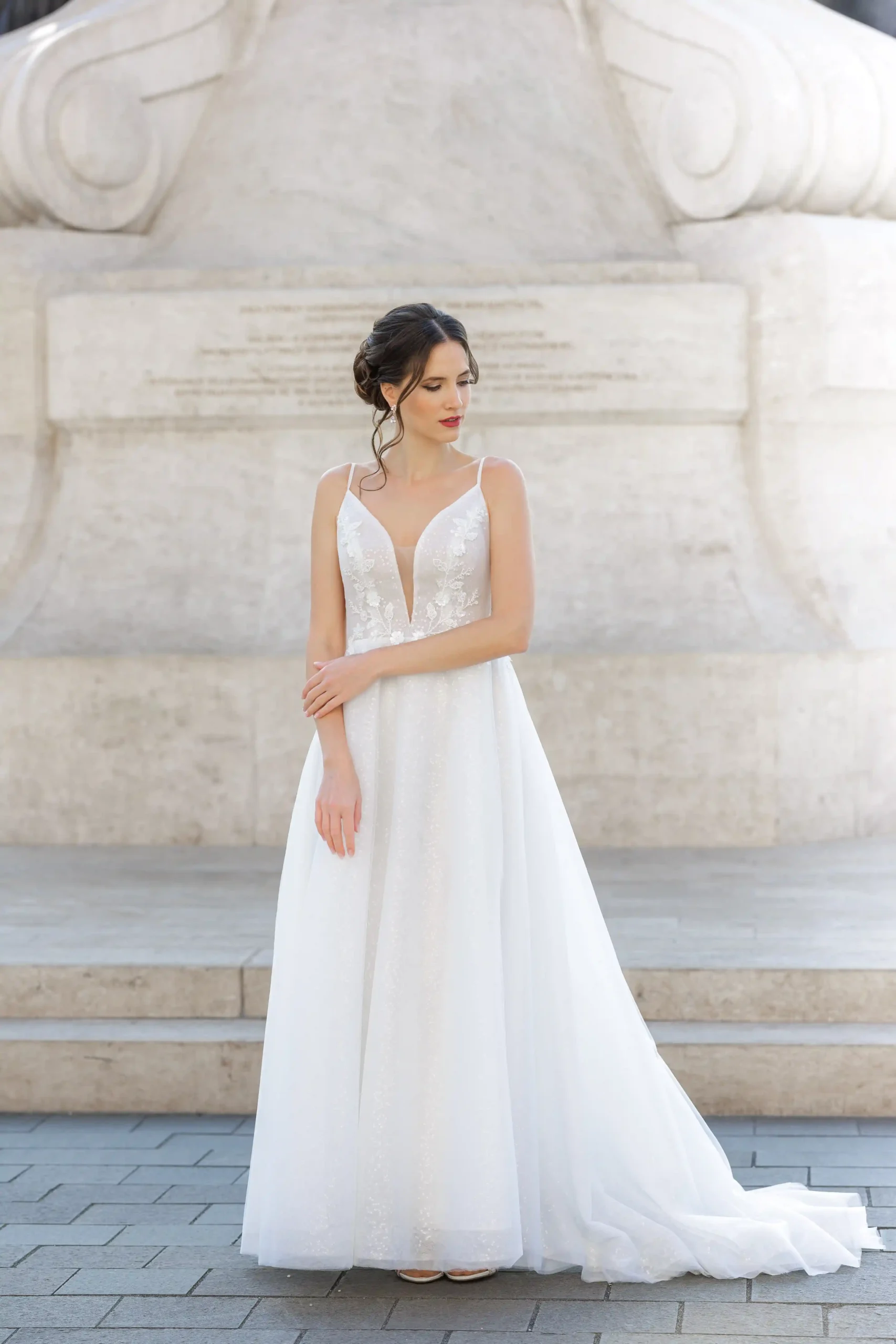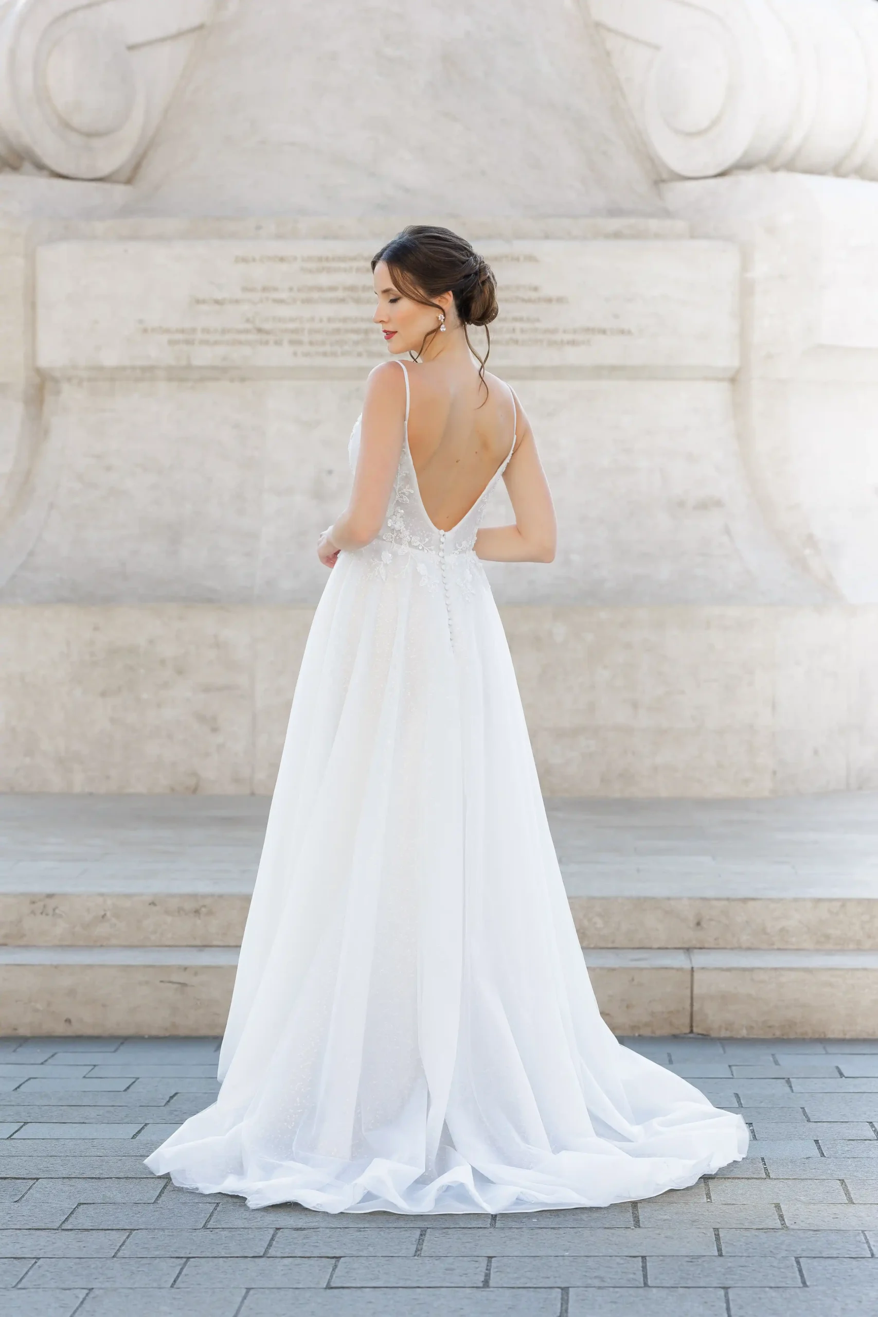 Kivételesen csak flitteres anyagot és a hozzá tartozó gyöngyös motívumot használtuk kíszítésnek. Egyszerű de látványos esküvői ruha. Nálunk egy élményt is kapsz a ruhapróbád mellé!