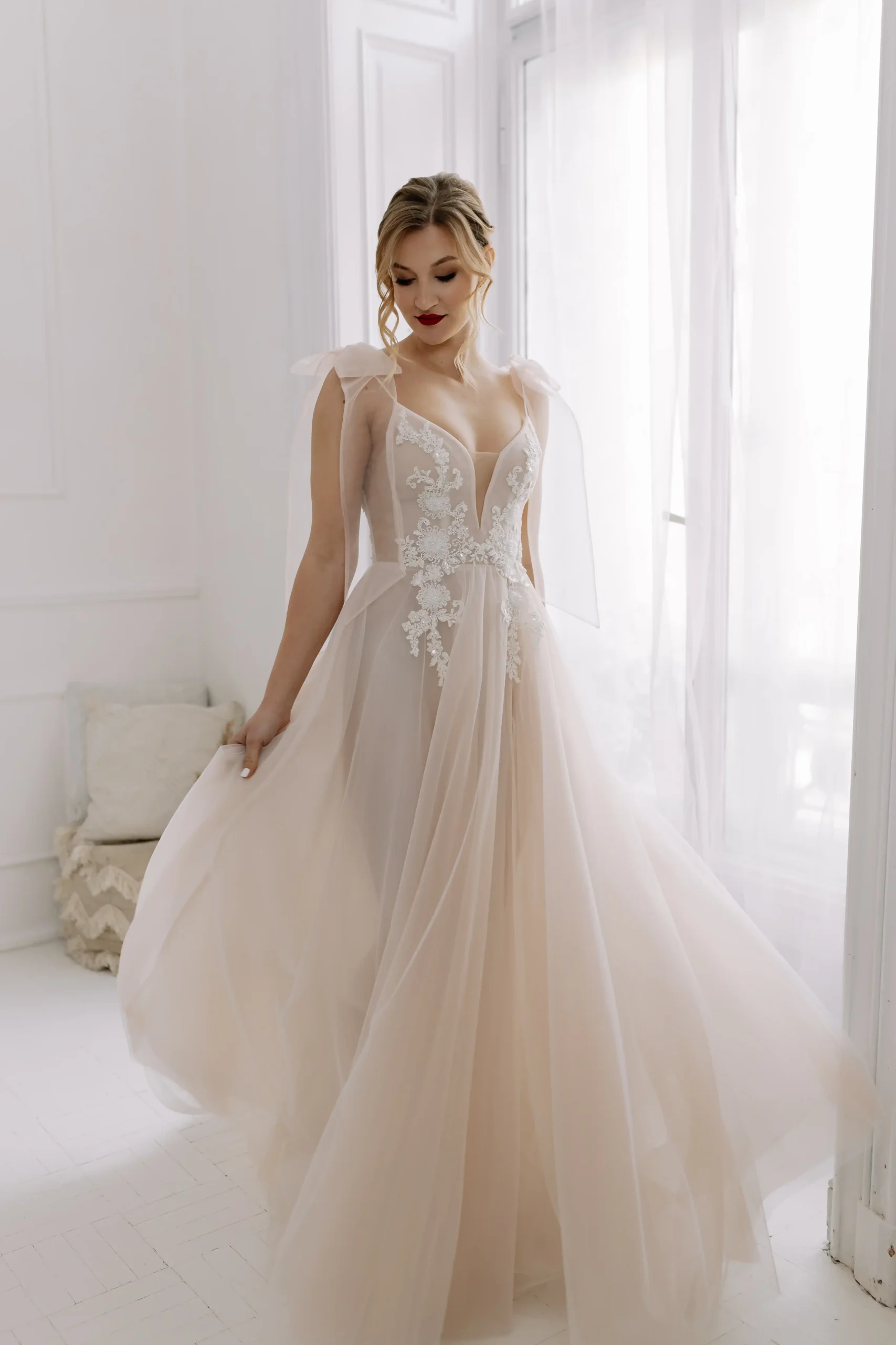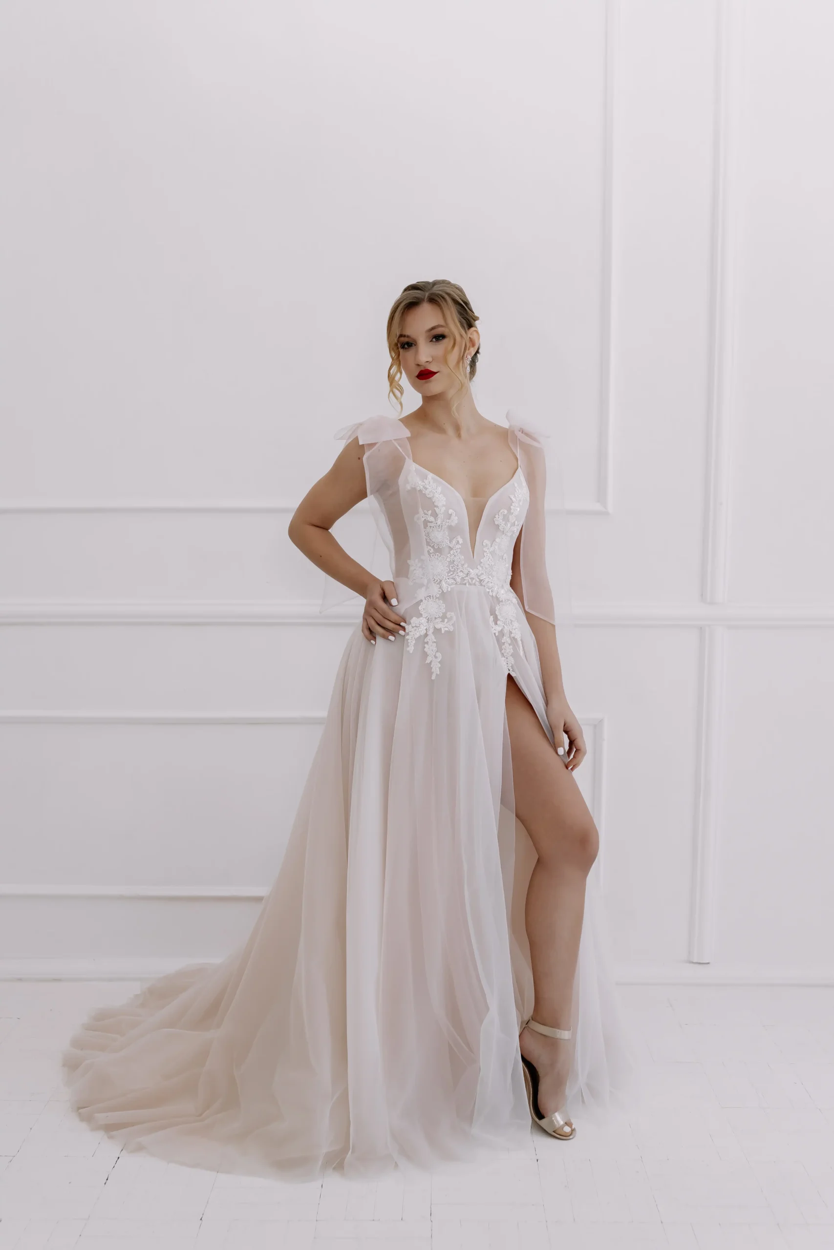 Púdersz színű légies modell. Tengerparti esküvőre ajánljuk főként. Laza, fiatalos látványa siker ruhánk már pár éve. Nálunk egy élményt is kapsz a ruhapróbád mellé!