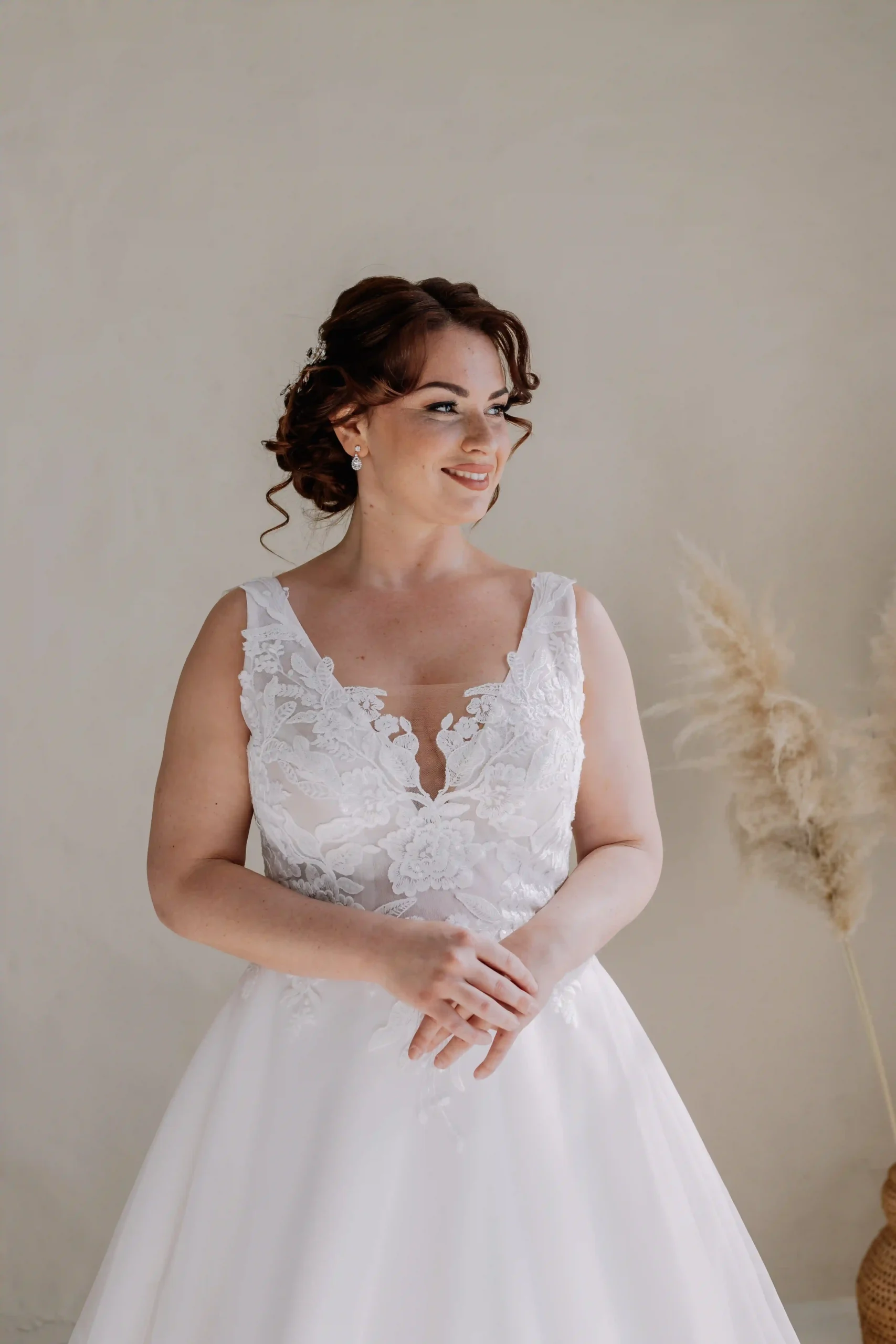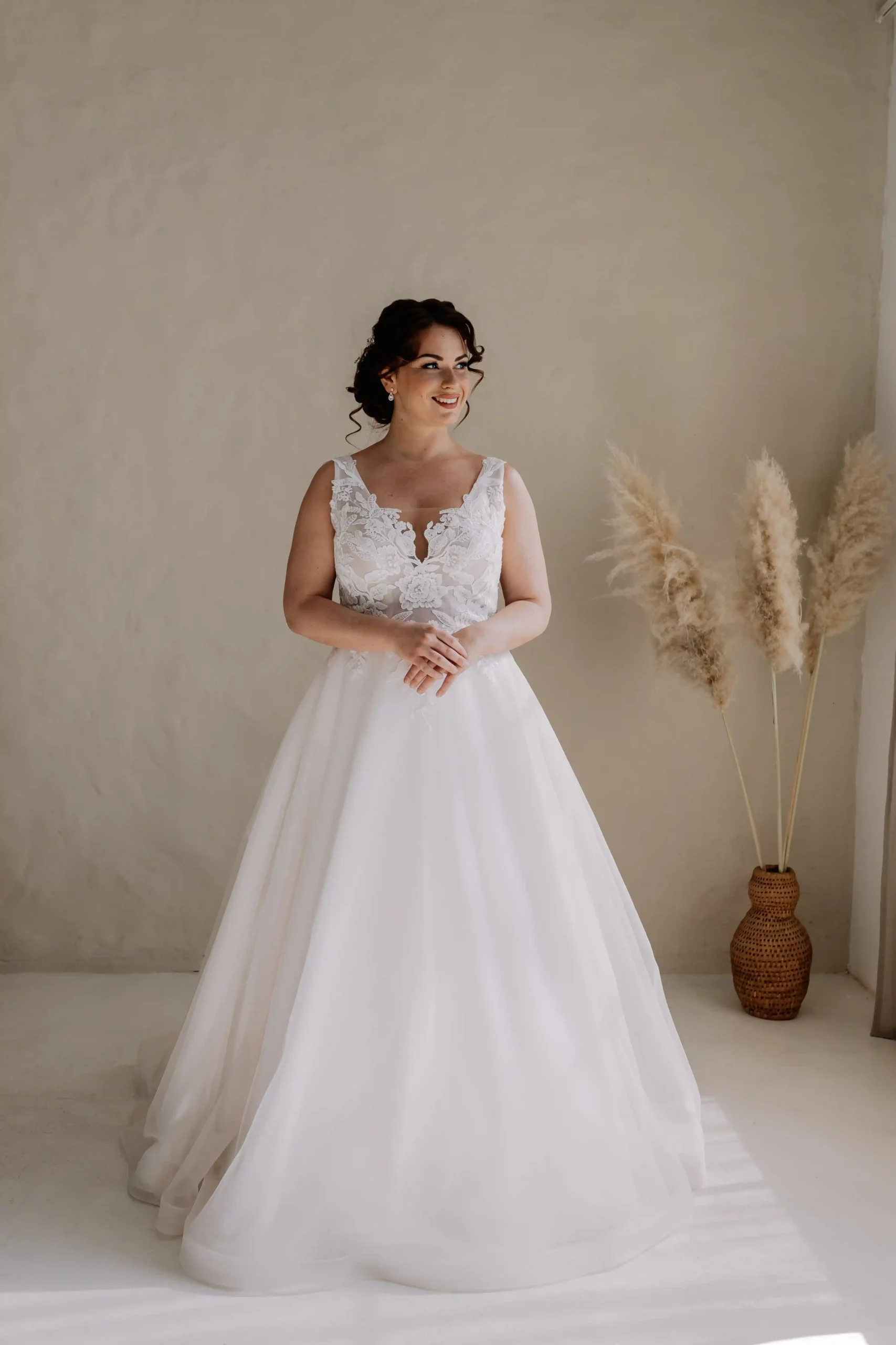Púder színű uszályos szoknyája és a különleges csipke megoldása remekül formája az alakot. Nálunk egy élményt is kapsz a ruhapróbád mellé!